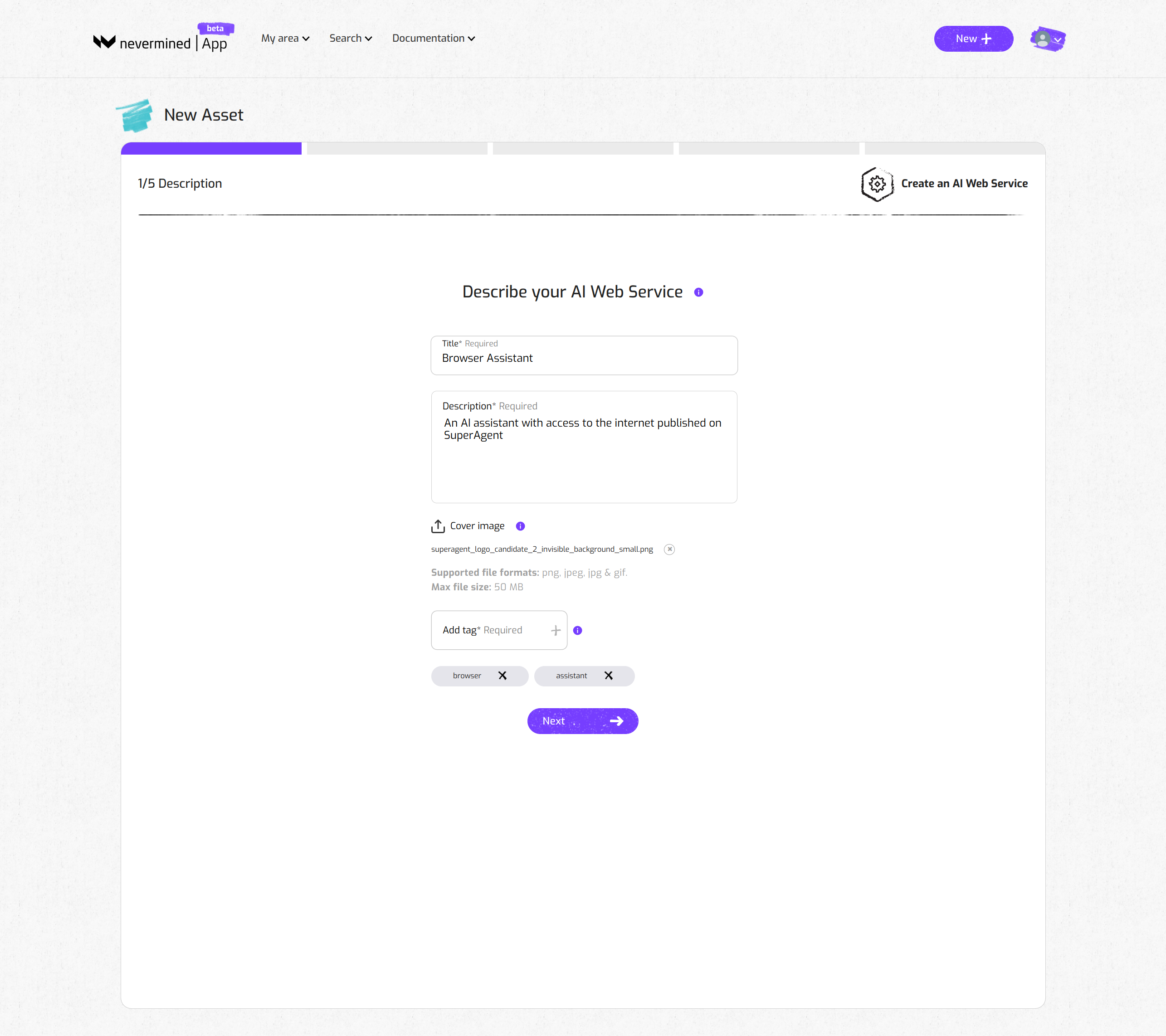 - You start by describing the AI Agent you want to register. To do this, provide a Title, Description and cover image for the AI service.