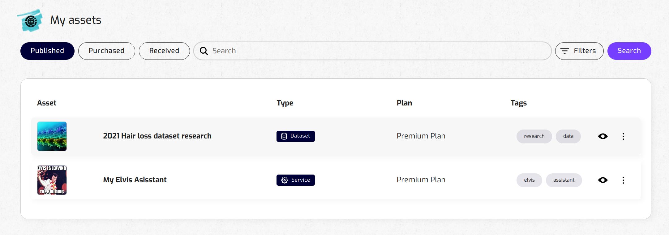 Go to the "Published" tab of the "My Agents" view to get an overview of your AI Agents/Services. Use the filter on the "Search" tab if you need it.