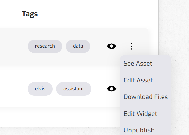 Nevermined provides embeddable widgets that Builders can use to promote their AI services in their own app or website. Just click on the three dots icon and select "Edit Widget".