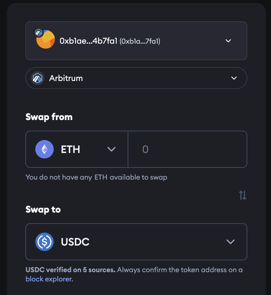 If you already have a token on the Arbitrum network (e.g. ETH), you can swap it for USDC. In the MetaMask home screen, choose Swap. Take note of transaction network fees and MetaMask fees.