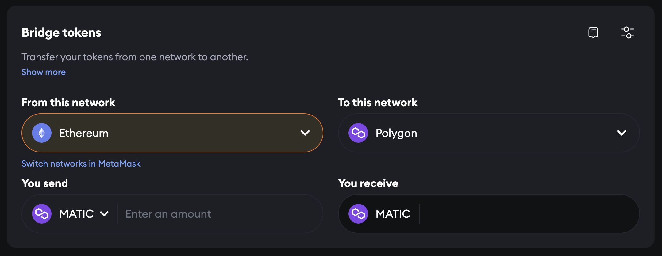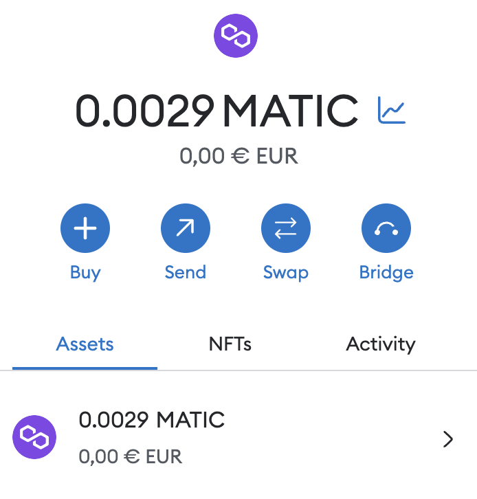 If you're connected to Polygon, you will find four buttons under your wallet balance: Buy, Send, Swap and Bridge.