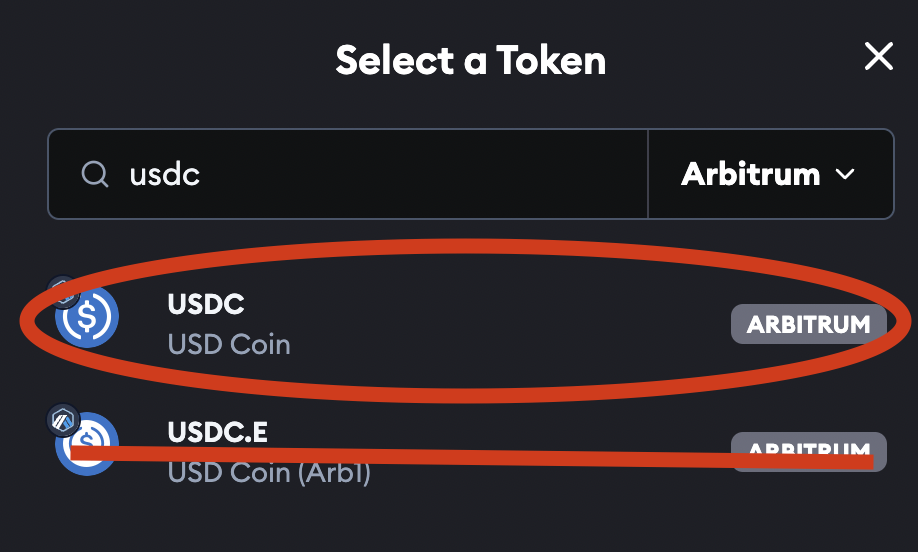 In the top field, type USDC and select the Arbitrum network from the dropdown. Important! Make sure you buy USDC, not USDC.e.